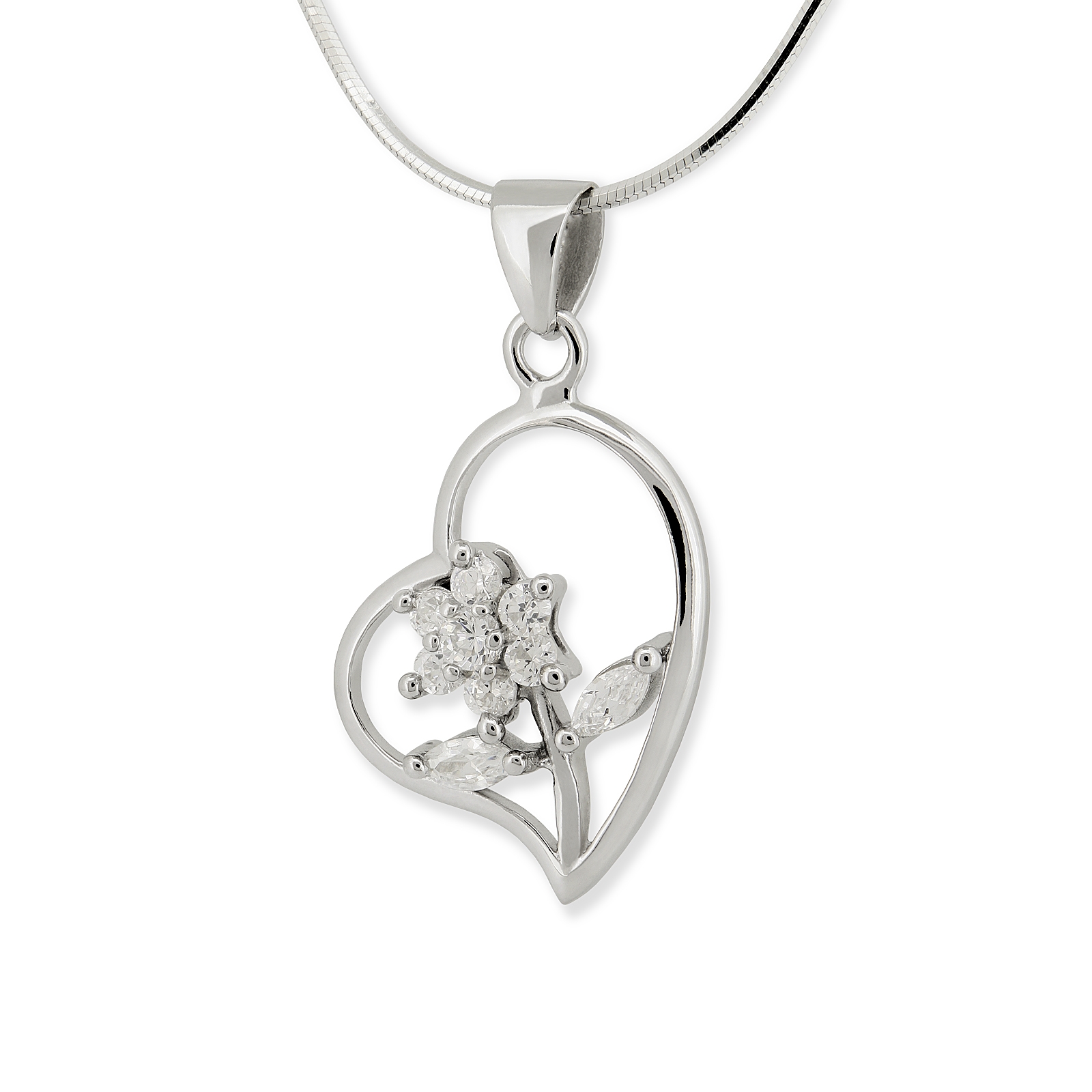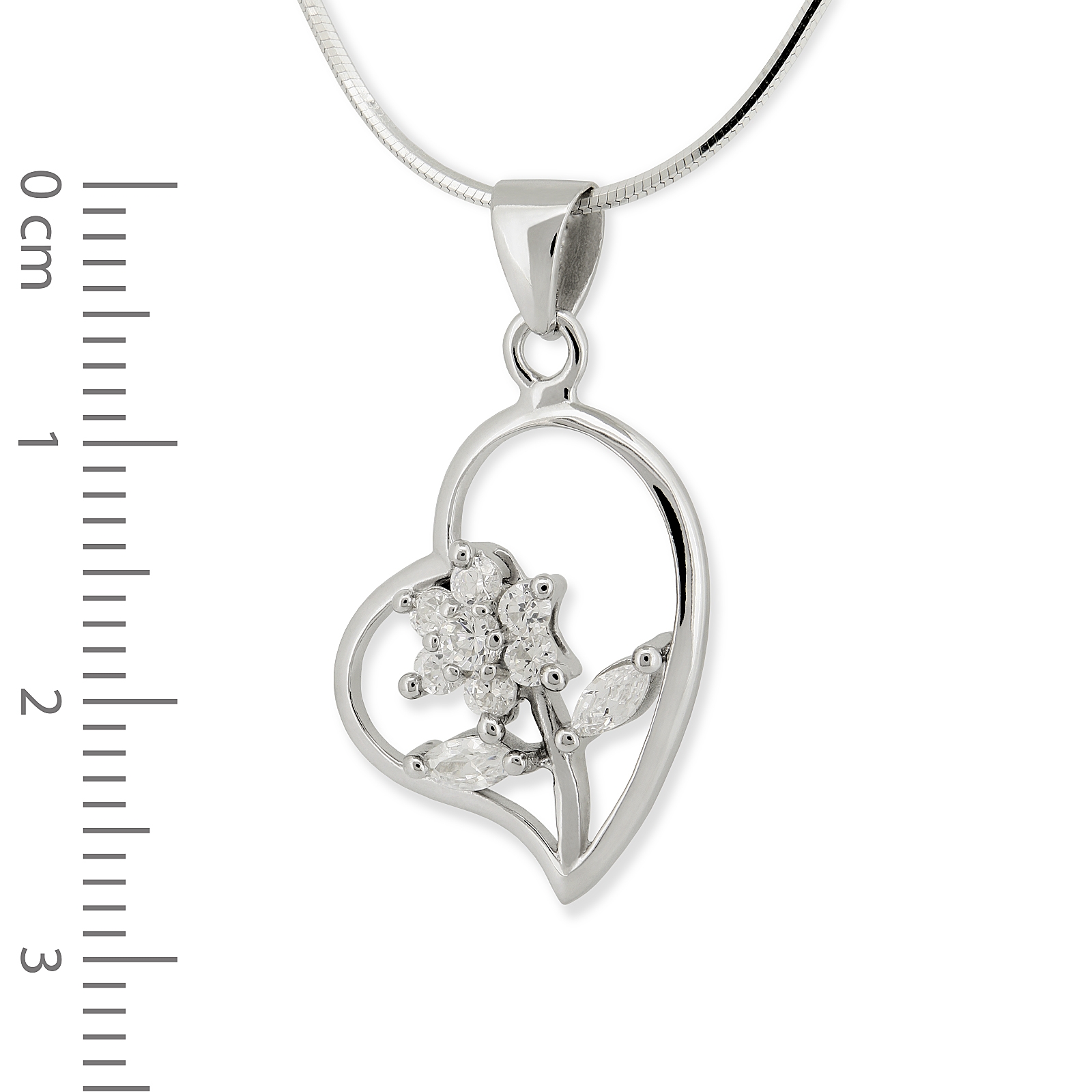 Srebrna rodowana zawieszka serce z kwiatuszkiem z cyrkonii w środku.